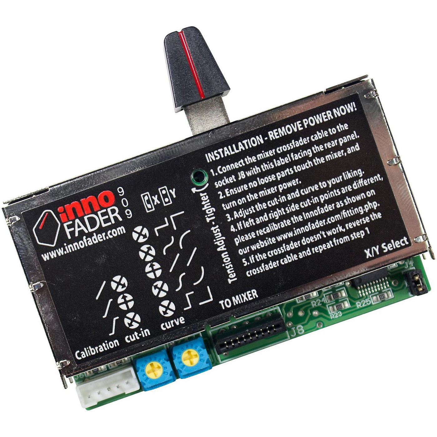 This Innofader model is custom designed to work in the Pioneer DJM-707 and DJM-909. It has all of the same adjustments as the original Innofader, and comes with mounting hardware, a calibration board, and lube kit.The Innofader is the ultimate replacement audio fader. It gives you an ultra precise ± 0.05mm cut-in accuracy for even tighter control of your scratches. Separate left and right cut controls make it easy to adjust without the need to recalibrate. It even has super-precise presets that allow you to do things like shift the cut point by a mere 0.04mm, less than the thickness of a human hair. The adapter boards are already insulated and marked clearly to show you the specific one you need for your mixer. The crossfader is at the very heart of the DJing experience. So why do so many mixers come with faders that feel like an afterthought? The feel of the crossfader is as important as any other feature of your mixer, so you deserve to have the best at your fingertips. The Audio Innovate innoFADER has been designed to completely change the way you feel about the crossfader. Having studied the habits and requirements of today’s DJs, the innoFADER offers unparalleled levels of quality and adjustability that you just don’t find in other crossfaders.You no longer need to be less than satisfied with the stock fader in your mixer.