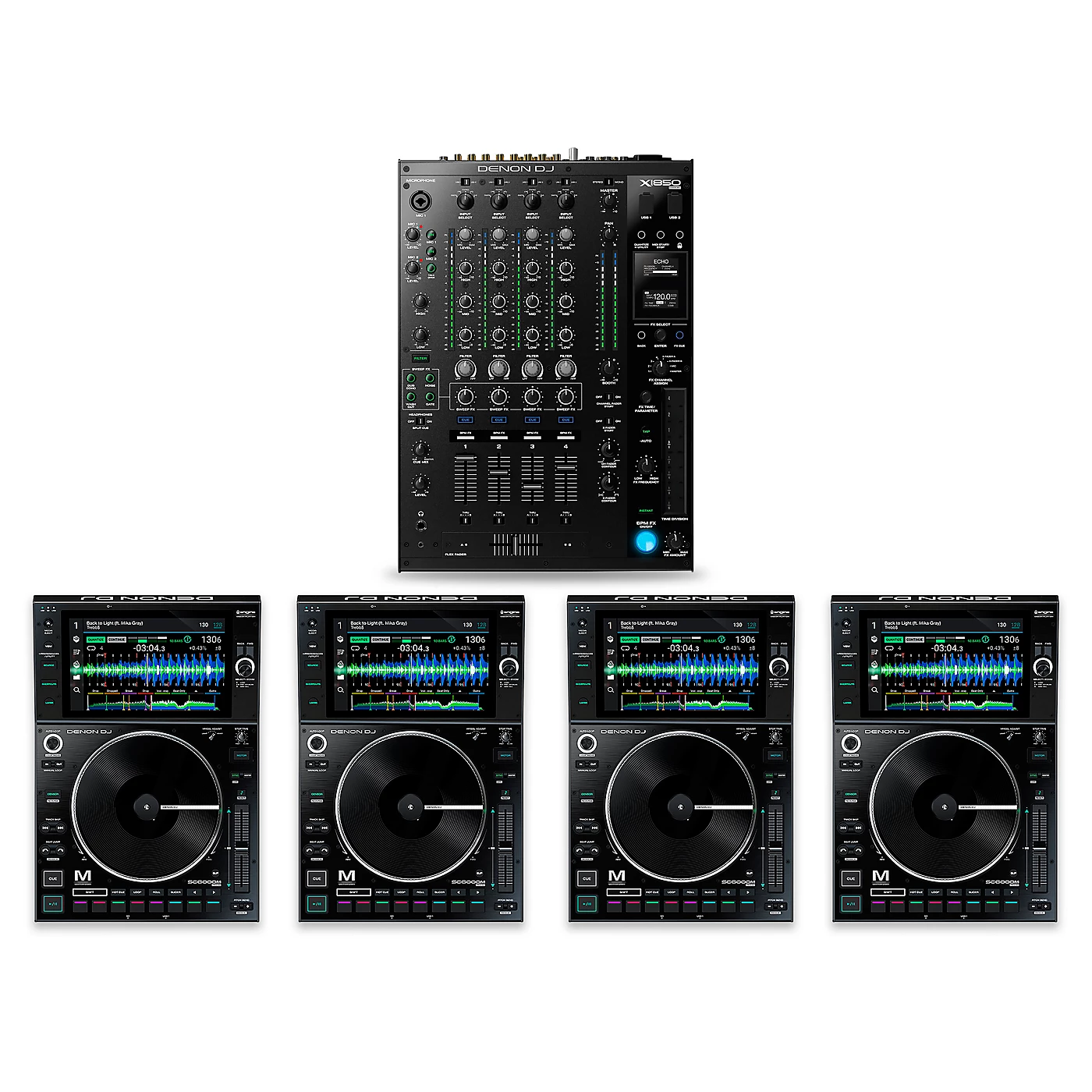 The Denon DJ PRIME Package is the ultimate bundle for the gigging DJ, containing an X1850 mixer and four SC6000M media players. The Denon DJ X1850 PRIME 4-channel mixer is ready to take on the main stage at any event, thanks in part to uncompromising audio quality. With dual 24-bit/96kHz USB audio interfaces, two DJs can play simultaneously with professional-grade sound. This makes for seamless transitions during DJ hand-offs, as well as back-to-back DJ sets. It also makes for clean, undistorted sound on big-rooms sound systems. The X1850’s 16 professional BPM FX and Time-Division Touchstrip let you activate rhythm-based adjustments on-the-fly. Independent Sweep FX on each channel give you the power to easily add exciting audio effects to your sets. Shape your sound with powerful Lo/Hi Pass Filter knobs on each channel. If you prefer to keep things simple, the X1850 has the same 3-band EQ on all four channels, just like you’d expect on a club-ready rig.The PRIME Package also includes four SC6000M media players. Based on the innovative SC5000M PRIME media player, each Denon DJ SC6000M boasts a 10.1″ touchscreen and Wi-Fi music streaming. Featuring a motorized 8.5″ jog wheel and eight performance pads, these professional-grade DJ media players are a dream come true for DJs that want the tactile experience of vinyl, but also want the flexibility and convenience of digital. It features a quick-release slipmat and redesigned DJ vinyl that moves independently of the main platter. Fine-tune the platter response with customizable torque adjustment. If you’re a scratch DJ, this is a game-changing feature that restores that vinyl feel you know and love.