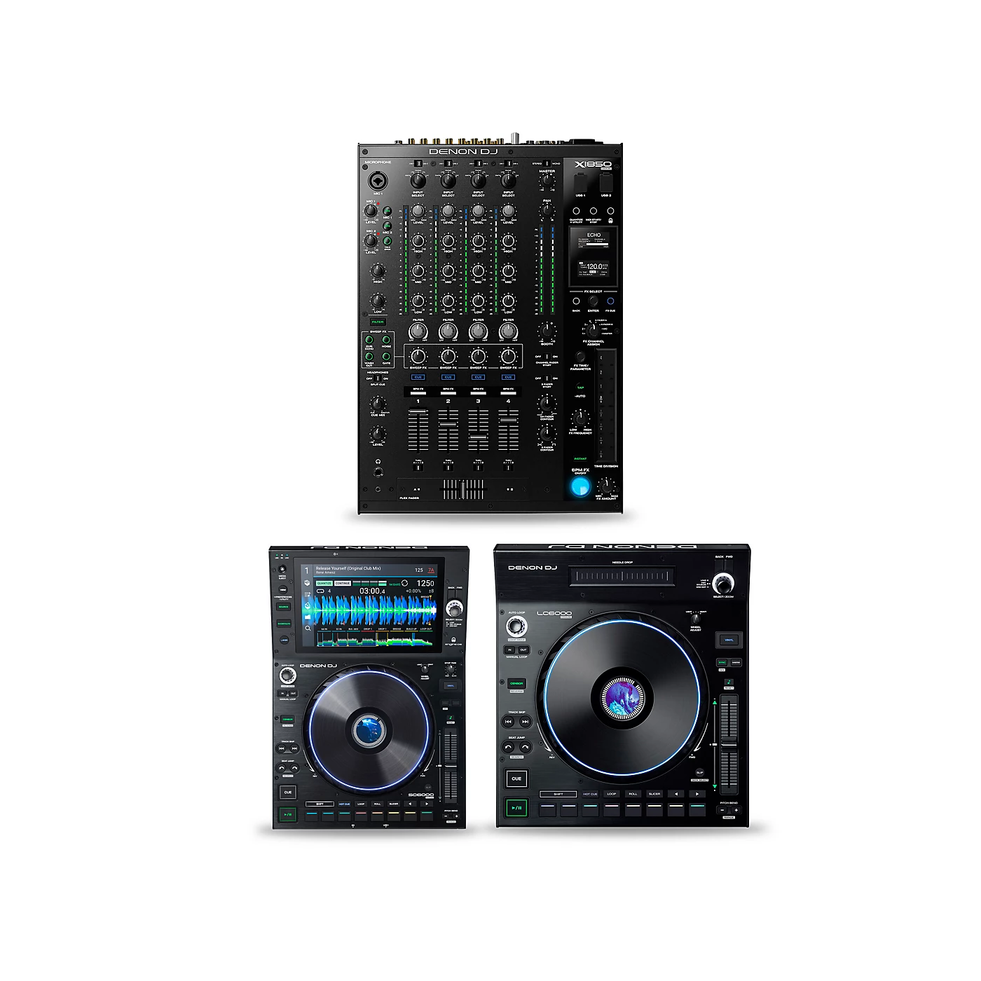 The Denon DJ PRIME Package is the ultimate bundle for the gigging DJ, containing an X1850 mixer, SC6000 media player and LC6000 DJ controller. The Denon DJ X1850 PRIME 4-channel mixer is ready to take on the main stage at any event, thanks in part to uncompromising audio quality. With dual 24-bit/96kHz USB audio interfaces, two DJs can play simultaneously with professional-grade sound. This makes for seamless transitions during DJ hand-offs, as well as back-to-back DJ sets. It also makes for clean, undistorted sound on big-rooms sound systems.Based on the innovative SC5000 PRIME media player, the SC6000 is boasts a 10.1″ touchscreen and Wi-Fi music streaming. Featuring a large 8.5″ jog wheel and performance pads, this professional-grade DJ media player is ready to take on the main stage at any event.Inheriting the same DNA from the ultimate club experience SC6000 PRIME, the Denon DJ LC6000 PRIME is an extremely versatile DJ controller bringing professional club-style layout, design and control to both standalone and laptop-based DJ workflows. With the same look, design and feel as the flagship SC6000 Media Player, the LC6000 PRIME gives DJs a professional hardware control for the second dual-layer audio output, unlocking the full potential of Engine OS-powered media players when controlling the secondary layer.