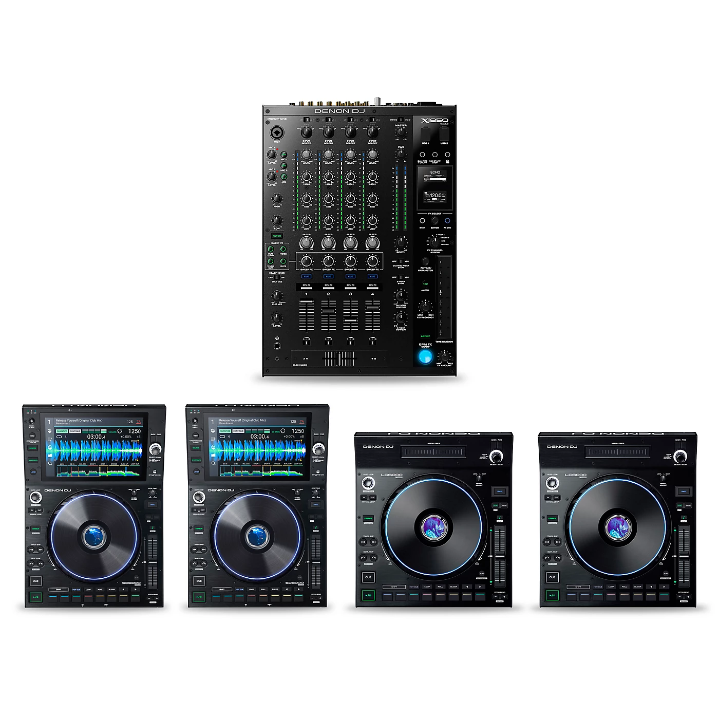 The Denon DJ PRIME Package is the ultimate bundle for the gigging DJ, containing an X1850 mixer, two SC6000 media players and two LC6000 DJ controllers. The Denon DJ X1850 PRIME 4-channel mixer is ready to take on the main stage at any event, thanks in part to uncompromising audio quality. With dual 24-bit/96kHz USB audio interfaces, two DJs can play simultaneously with professional-grade sound. This makes for seamless transitions during DJ hand-offs, as well as back-to-back DJ sets. It also makes for clean, undistorted sound on the sound systems in big rooms. The X1850’s 16 professional BPM FX and Time-Division Touchstrip let you activate rhythm-based adjustments on the fly. Independent Sweep FX on each channel give you the power to easily add exciting audio effects to your sets. Shape your sound with powerful Lo/Hi Pass Filter knobs on each channel. If you prefer to keep things simple, the X1850 has the same 3-band EQ on all four channels, just like you’d expect on a club-ready rig.Based on the innovative SC5000 PRIME media player, the Denon DJ SC6000 media players boast a 10.1″ touchscreen and Wi-Fi music streaming. Featuring a large 8.5″ jog wheel and performance pads, these professional-grade DJ media players are ready to take on the main stage at any event.Inheriting the same DNA from the ultimate club experience SC6000 PRIME, the Denon DJ LC6000 PRIMEs are extremely versatile DJ controllers bringing professional club-style layout, design and control to both standalone and laptop-based DJ workflows. With the same look, design and feel as the flagship SC6000 Media Player, the LC6000 PRIME gives DJs a professional hardware control for the second dual-layer audio output, unlocking the full potential of Engine OS-powered media players when controlling the secondary layer.