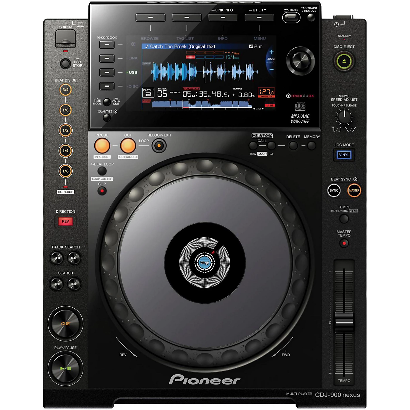 The CDJ-900 was specifically designed for today’s professional DJ. The CDJ-900’s new multi-format digital turntables allow the DJ’s to access, search and control their content directly from the player itself. The CDJ-900 provides the same legendary quality standards and playability of the CDJ-800 with the added convenience of native playback of key DJ digital media files formats accessed via a multitude of compatible medium – CD, portable hard drive/flash media devices.Adapting to the expanding variety of media formats, the CDJ-900 enables playback of MP3, AAC, WAV and AIFF audio files from CDs and USB memory devices. A USB port located on top of the turntable enables users to quickly connect an external storage device such as a Tonium Pacemaker or a hard drive packed with music files, minimizing the need to bring a laptop computer to performances.The CDJ-900 turntable includes rekordbox, Pioneer’s proprietary music management software that organizes and catalogs a DJ’s entire music library. When music files are imported to rekordbox, the software analyzes each file and prepares them for use specifically with the new CDJ turntable. Users can then transfer analyzed music files to their preferred storage media and play them directly from the new CDJ turntable. The software offers song information that can be viewed easily during performances on the CDJ’s large display to quickly search and access content by genre, title, BPM, etc. Also, as analyzed tracks are played through the CDJ product, the turntable automatically creates and saves a play history enabling users to review past performances on their PCs.Pro DJ LinkThe CDJ-900 features Pioneer’s Pro DJ Link that enables up to four CDJ-2000/900s to be connected via the Link Port to share a single music source, whether it is a hard drive, USB and/or SD memory card. Once linked, users have the ability to quickly find, display and choose the music file from a connected source through the CDJ’s built-in display and control knobs. A quick turn of the knob lets users scroll through created files and folders and a push of the knob confirms the song choice.Advanced ConnectivityThe new turntable features a 24-bit/48kHz sound card and HID and MIDI control compatibility via USB port. Up to 35 controls on the surface of each player can be used to trigger other devices, such as DJ effecters and software by way of HID and/or MIDI. The HID controls were implemented into the player for superior interfacing with software, faster communication speed over MIDI, audio/visual streaming and two-way information on the display. HID enables easy, precise and native control of DVS systems such as Native Instruments’ Traktor series and MixVibes Cross2 without the need for time-coded discs.CDJ-900 EnhancementsSlip Mode – When activated, Slip Mode silently continues song playback during a loop, reverse or scratch and continues audible playback at the exact time when the loop, reverse or scratch is ended creating smoother transitions.Advanced Auto Beat Loop – The CDJ-900 generates a four-beat loop at a touch of a button creating a customized sound to provide more time for DJs to blend in transitioning music.The ExtrasFor more accurate tempo control while mixing, the player is enhanced with increased frame increments of 0.5 frames that allow the DJ to set a cue point or loop point with more precision. To achieve the highest sound quality, the CDJ-900 was equipped with the audio industry’s highly respected Wolfson DAC processor, delivering a very transparent, accurate audio signal resulting in a highly improved signal-to-noise ratio and increased headroom.