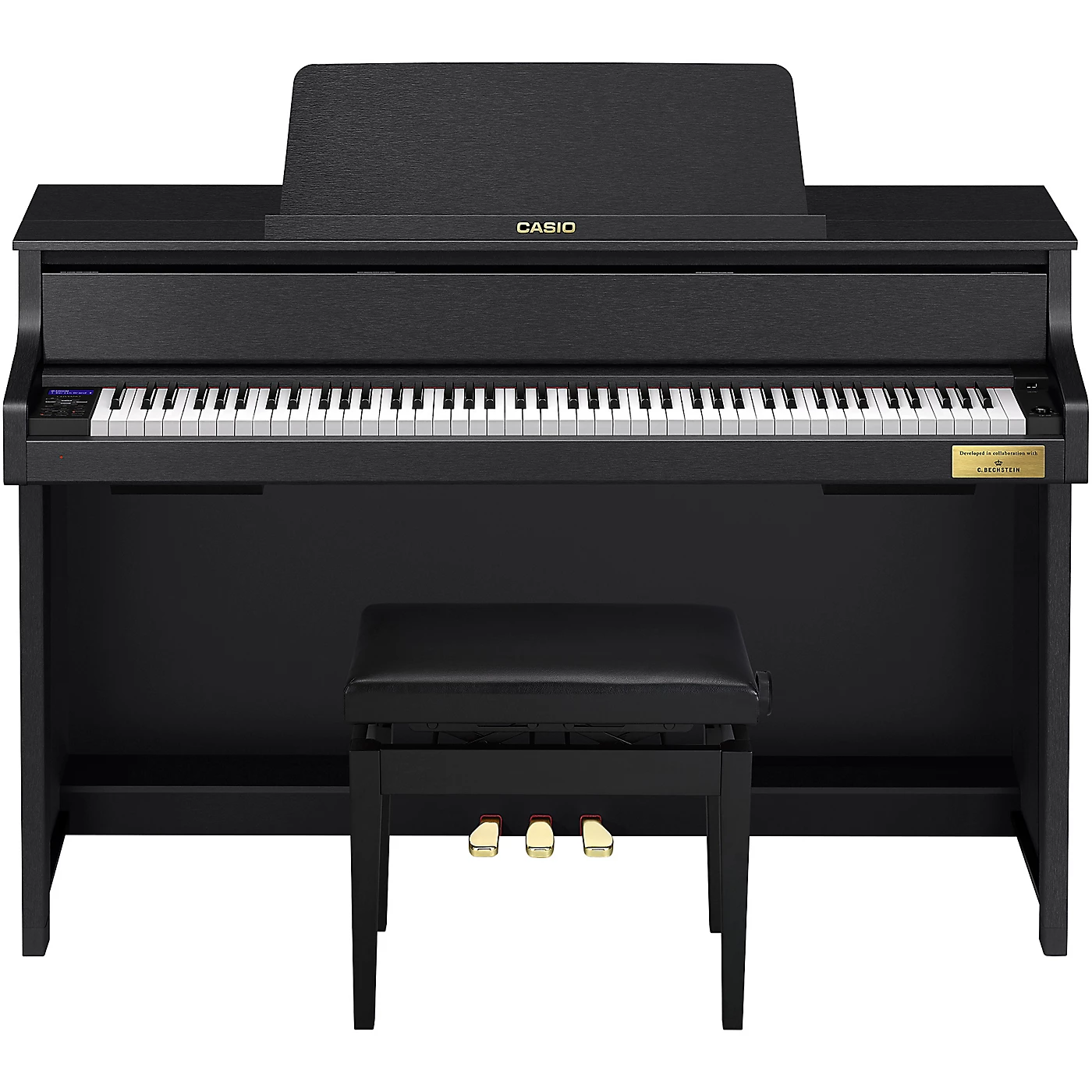 The Celviano Grand Hybrid GP-310BK blends innovation with traditional. From the moment your hands touch the keys, the GP-310 Grand Hybrid delivers the authenticity your performance demands.Authenticity Begins at the First TouchThe Natural Grand Hammer Action keyboard is made with full-length, wooden, concert grand piano keys, using the same materials and processes as the C. Bechstein concert grand pianos. A keypress sends a hammer along the same vertical path as a grand piano, with the same essential weighting and pivot points, resulting in a true and uncompromising piano touch. The GP-310 features an enhanced touch response algorithm that allows for an even more accurate response. Players will feel more control with a softer touch, enabling flawless expression of the most subtle of performances.Three Legendary Grand PianosCasio’s AiR Grand Sound Source provides not just one, but three of the world’s finest grand pianos. Dubbed the Berlin, Hamburg, and Vienna Grands, each one is the result of countless hours of precise analysis and study of their unique characteristics. They are faithful and expressive recreations of these distinctive pianos, with the Berlin Grand sound developed in collaboration with C. Bechstein. String/damper resonance, mechanical sounds, and other subtle nuances complete the experience of owning three of the finest pianos on Earth. The GP-310 enhances the sound of these sought-after instruments with longer, more natural decay than its predecessor, ensuring each sustained note tells a complete story.Grand Acoustic SystemUsing an exclusive six-speaker amplification system, the new Grand Acoustic System reproduces the three-dimensional sound field generated by an acoustic grand. The top speakers present sounds normally heard rising upwards, and the downward-facing speakers present sounds heard from below the soundboard. This simulation fills the room with rich, complex sound, reaching both the performer and the audience. The GP-310’s speaker system is more powerful than its predecessor, with larger drivers making effective use of the powerful built-in amplifiers.Under The LidThe speaker system reproduces deeper, richer bass tones while enhancing the clarity of mid-range and treble frequencies. When the volume is adjusted, each speaker is automatically optimized to strike the perfect balance you’d expect from a meticulously maintained grand piano. New equalization options allow greater flexibility for recording and large scale performance. Now, you can choose to either maintain the pure sound of the six-speaker Grand Acoustic System when connecting to the line outputs or headphone outputs, or to hear the sound from the speakers exactly as it’s being delivered to the line outputs, minus the equalization that optimizes the sound for the Grand Acoustic System. You can also choose to disable the speaker system entirely, even without headphones connected. This solution is ideal for music labs or other educational settings, where the line outputs are used to connect to student headphone interfaces.A Soft SpotThe all-important soft pedal is essential for accurate dynamics, not only in volume, but in tone. The new GP-310 improves the effect of the soft pedal by adjusting the changes in both volume and tonal color based on the strength you use to strike the keys while the pedal is pressed.HarpsichordAn enhanced harpsichord Tone has been added, including the distinctive “key-off” sound that occurs when lifting your fingers from the keys.Striking a BalanceA longtime favorite feature for classical players, Concert Play gives you a starring role playing with a symphony orchestra. Now, you can fine-tune the volume of your piano part, ensuring you are right where you want to be in the mix. This adjustment is also available while playing along with the built-in Song library.Seeing Is BelievingThe high-contrast display on your Grand Hybrid features an inverted color scheme, allowing for easier reading from further distances and wider angles. The overall brightness is now focused on the text, leaving the rest of the display darker so you can focus on your performance.