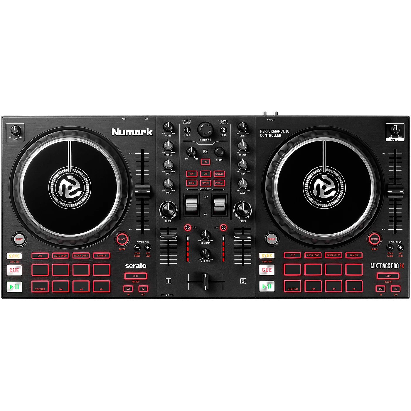 The Numark Mixtrack Pro FX is a Serato DJ controller designed to develop and build your DJ skills. It has everything you need to sound professional right away: large 6” jog wheels, 24-bit digital soundcard for pristine sound quality; 6 dedicated software FX buttons for easy transitions; and 16 performance pads for hot cues, auto loop, fader cuts and sampling. Plus, you can stream the music you love direct from TIDAL or Soundcloud via Serato DJ Lite. With the Numark Mixtrack Pro FX, everything the modern DJ demands is here. Entering a world of pro DJ performance has never been simpler. Center stage on Mixtrack Pro FX are two all-new premium paddle triggers for effortless command over Serato’s built-in software effects; there’s even quick access buttons to essential effects, including Echo, Reverb, Flanger, Phaser, HPF (High Pass Filter) and LPF (Low Pass Filter)—a sure fire guarantee that everything you need for creating buildups, crafting unforgettable transitions and adding your own unique spin to your mix is only a touch away. Mixtrack Pro FX’s large 6″ capacitive-touch jog wheels emulate an authentic turntable feel for scratching and precise cue placement, while the rugged grooves on the platters side enables you to nudge your mix perfectly into place. With Mixtrack Pro FX’s 16 multi-function backlit performance pads, you can inject a dose of true DJ performance and remix, mash-up and transform your tracks. With dedicated quick-access pad mode buttons per deck for Hot Cues, Auto Loop, Sample and Fader Cuts (a signature crossfader effect that emulates a 1-4 click are on the pads), reimagine and reinterpret your favorite tracks and create something totally unique. Dedicated Auto Loop Mixtrack Pro FX’s Auto Loop makes it simple to mix and blend between songs, increasing or decreasing the loop segment with the onboard Loop Multiplier buttons to make electrifying build-ups. Serato DJ Ready Mixtrack Pro FX comes pre-mapped with Serato DJ Lite for Mac and PC (software included) and is upgrade-ready to the full version of Serato DJ. For first-time DJs, Serato DJ Lite now comes with demo music and an easy on-boarding tutorial that will walk you through the basics so you can start DJing right away. Built on Serato DJ Pro technology, Serato DJ Lite is designed to be intuitive, reliable and rich in features. Stream Millions of Songs The Mixtrack Pro FX comes with Serato DJ Lite, giving you access to stream millions of songs via WiFi from TIDAL or SoundCloud. Upgrade to Serato DJ Pro to unlock even more advanced features. Feature Packed Mixtack Pro FX features everything you need for immediate DJ performance, right out the box. Fusing plug and play high speed USB connectivity, a dedicated mixer section outfitted with a full 3-band EQ, filter knobs, channel faders and a cross fader, plus an onboard microphone input and headphone output, Mixtrack Pro FX covers all your bases, catering for anything your next DJ set demands.Free 2-Month SoundSwitch Trial Included Take your DJ performance to new and exciting levels with SoundSwitch lighting control software. SoundSwitch bridges the gap between DJ software and lighting systems by seamlessly synchronizing DMX lighting with live audio, through easy-to-use software and built-in lighting automations.