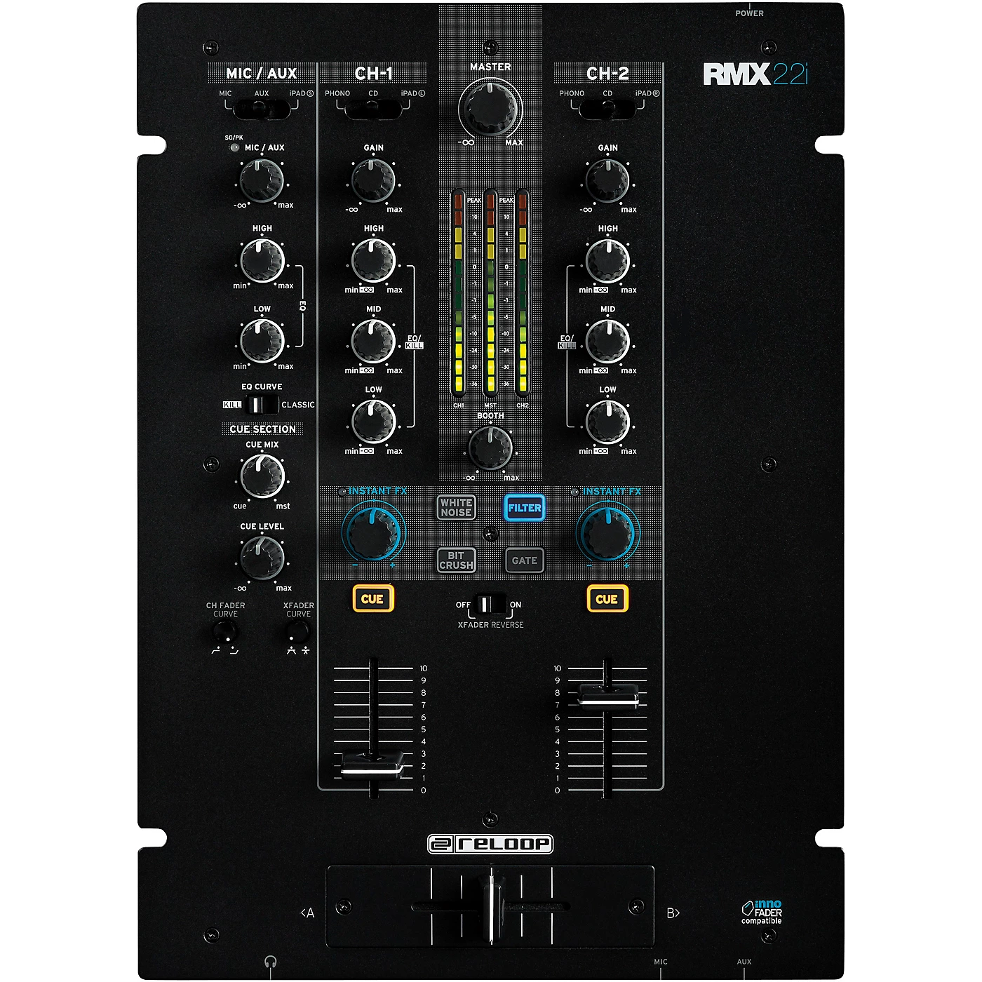 The Reloop RMX-22i is a 2+1 channel DJ mixer with digital audio architecture and integrated Instant Sound Color effects. This compact club-style mixer benefits from the same high quality build and sound characteristics that are already found on the flagship RMX-80 Digital mixer.Smart tablet split connectionAn iPad split input on the rear of the mixer makes it possible to include an iPad, Android tablet or smartphone directly into your DJ set-up via 3.5 mm jack to the RMX-22i.The supplied iPad split cable can divide the audio signal into two separate mono channels or delivers one stereo output. This connection method means DJ apps with split-cue function (like DJAY by Algoriddim) can be utlisied, as can the stereo output from production or sampler apps.Instant Sound Color effectsThe RMX-22i has four high-quality digital Sound Color effects built-in. White noise, Filter (low and high-pass), Bit Crusher and Gate can be assigned to the dedicated Instant FX potentiometers at the push of a button. The effects can be used for any channel and are modulated via a large, ergonomic bi-polar potentiometer to achieve exactly the sound you want.ISOLATOR / CLASSIC EQThe instantly recognisable mixer layout has a three-band EQ section that can be easily set to ‘Kill’ (isolator mode) or ‘Classic’, to suit any individual mixing style.Flexible fader sectionThe line- and cross-fader curves are adjustable on the mixer surface, so smooth mixes and hard cuts can be carried out quickly and changed mid-routine. In addition to curve adjustment, the cross-fader and line-faders can be set to auto-start or crossover-reverse to suit the needs of your performance.Multiple connection possibilitiesWith a total of eight inputs and five outputs, you will always find the right connection for any analogue or digital source. The output section benefits from both RCA and XLR outputs for trouble-free connection of the master signal to any PA system.INNOFADER-readyThe RMX-22i’s high-quality crossfader can also be upgraded with the new Reloop Innofader by Audio Innovate for a truly unrivalled performance at a very appealing price.