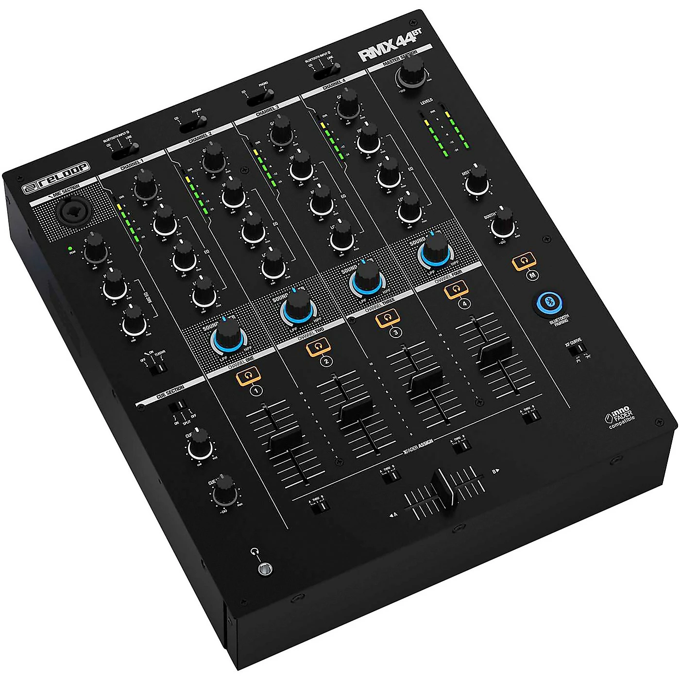 The Reloop RMX-44 BT is a 4-channel Bluetooth DJ club mixer in classic design, including aBluetooth input with cue function, which offers numerous application possibilities.The intuitive Club mixer layout guarantees a simple overview and allows experienced artists to findtheir way around immediately.With 9 inputs and 4 outputs, as well as a 3-band EQ and bipolar filter unit per channel, the RMX-44 BT is not only a full-fledged DJ club mixer, but thanks to Bluetooth compatibility and the 2-band EQ microphone section with talk-over function, it is also ideal for bars, mobile DJs and home setups.For creative frequency mixing, the RMX-44 BT offers dedicated, bi-polar sound filters per channel to allow smooth low- and high-pass fading. The fully digital sound architecture enhances your sound to be clear and punchy in every situation.The sturdy metal construction and scratch-resistant surface with a deep black metallic finish make the RMX-44 BT extremely durable, despite frequent use and transport. The fabrication meets the industry’s highest quality standards and is visually and haptically particularly attractive. In addition, the stylish and timeless design blends perfectly into any DJ setup.