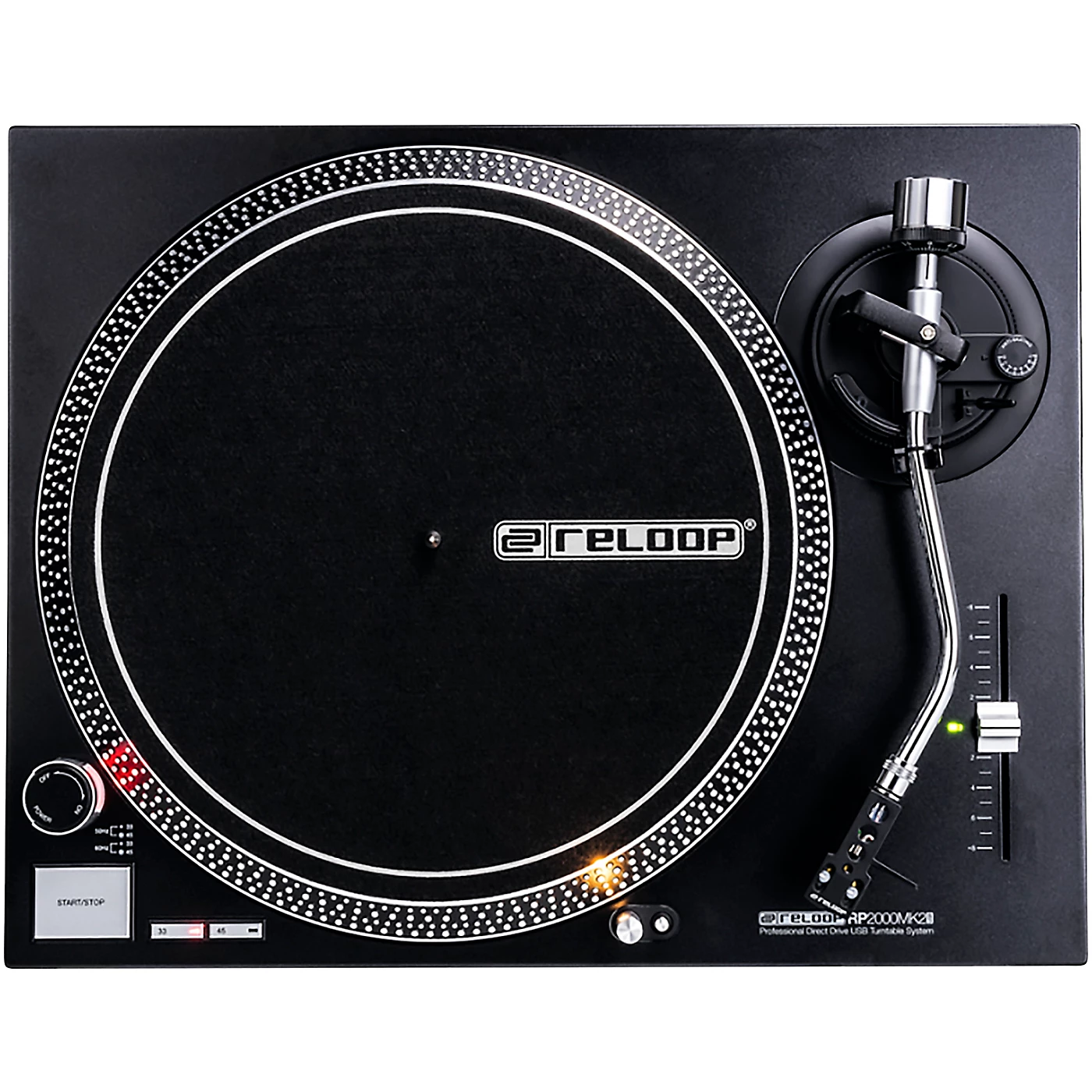 The Reloop RP-2000 USB MK2 direct-drive turntable features significant upgrades over its predecessor, the RP-2000 USB. It has a redesigned chassis with reinforced housing construction. The RP-2000 USB MK2 uses a precision-engineered, die-cast aluminum platter for stable rotation. It’s ideal for beginning DJs, audiophiles and casual listeners alike.What sets this record player apart from most is its high-resolution USB connection. This enables you to record and digitize your vinyl albums very easily. Set up is fast, as no driver is required, and the built-in phono pre-amp allows for line level output. Thanks to a built-in phono preamp, the Reloop RP-2000 USB MK2 doesn’t require grounding.Other improvements to the RP-2000 USB MK2 turntable include its reworked metallic buttons. They offer enhanced feel and tactile response. They also have a stylish, deep black metallic look. The RP-2000 USB MK2 record player has precision pitch control. Users can also select from two different pitch ranges: +/-8% and +/-10%. The turntable’s powerful motor offers 33 1/3 and 45 RPM speed options.A statically balanced S-shaped tonearm features hydraulic lift and an anti-skate mechanism. Reloop built shock-absorbing feet into the RP-2000 USB MK2 to isolate vibration. Additional damping features built into the heavy-duty chassis optimize sound quality. With an included Ortofon OM Black headshell and stylus, the RP-2000 USB MK2 is ready to breathe new life into your vinyl record collection. Your old classic albums will sound like you’ve never heard them before.