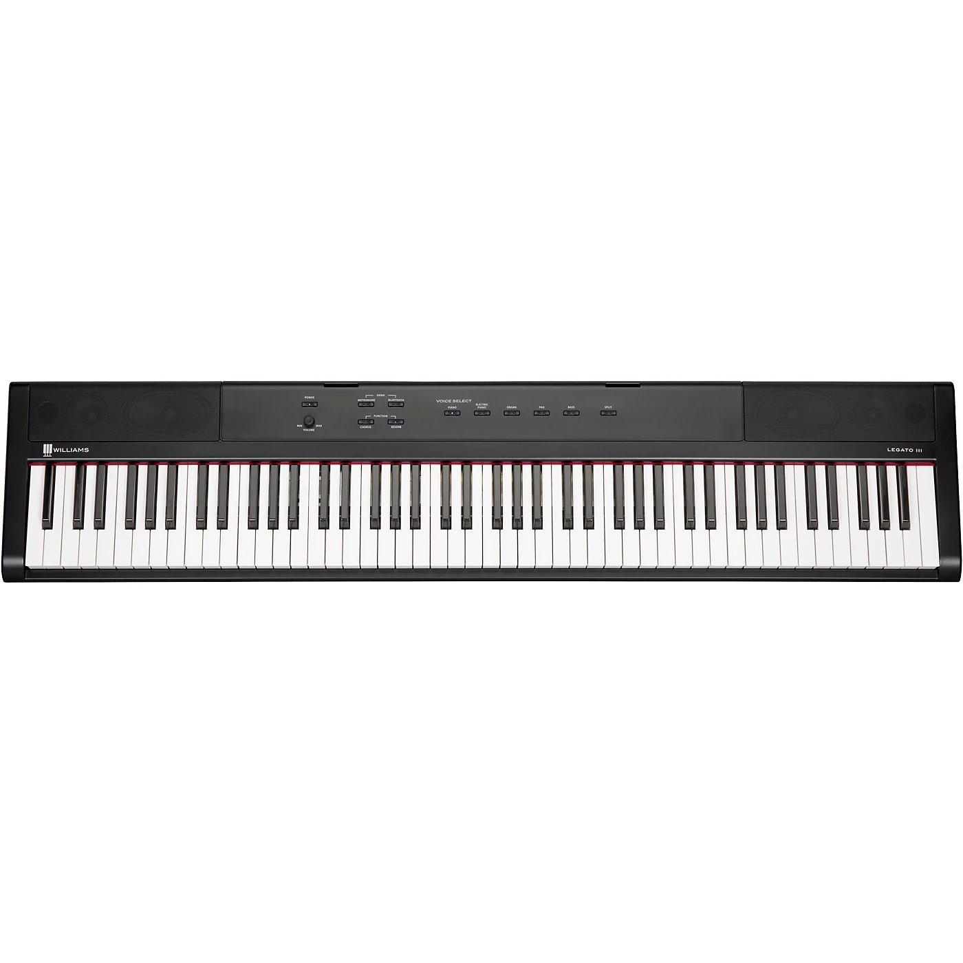 The Williams Legato III is a full-size digital piano with 88 touch-sensitive keys, Bluetooth MIDI capabilities, iOS app and built-in speakers. More than just a great-sounding instrument for playing, practicing and performing, the Legato III includes sounds from the incredible Williams Custom Sound Library featuring a collection of impressive piano and vintage keyboards. The Legato III boasts dual-driver speakers that deliver lush tones with outstanding and room-filling clarity and volume. Bluetooth MIDI functionality connects wirelessly to your iPhone or iPad to run educational software for additional learning, while Williams iOS app provides easy access to your Legato III advanced menus—as well as self-teaching aids. The Legato III can run on batteries or with the included AC power supply. Another added bonus, the Legato III includes a free 90-day Skoove Premium subscription with over 400 interactive piano lessons to help build playing and music reading skills.