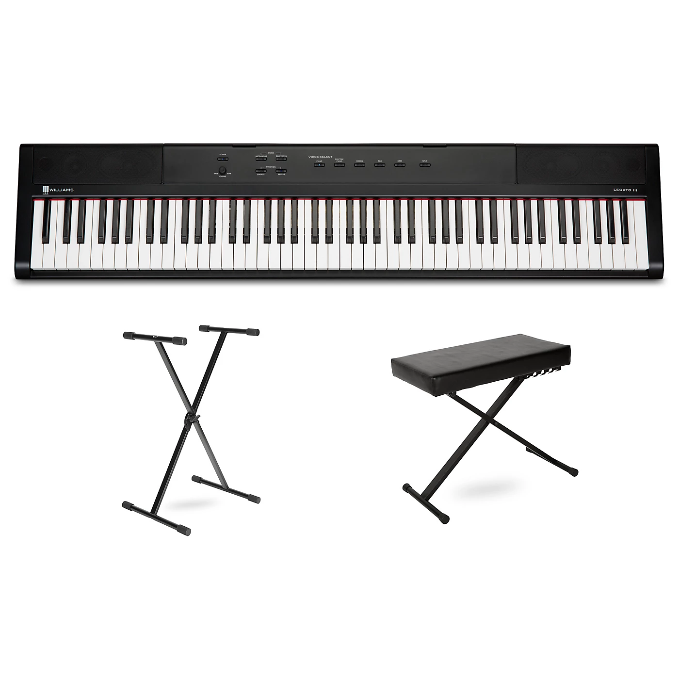 This package features the Williams Legato III digital piano, keyboard stand and bench for a convenient all-in-one bundle. The Williams Legato III is a full-size digital piano with 88 touch-sensitive keys, Bluetooth MIDI capabilities, iOS app and built-in speakers. More than just a great-sounding instrument for playing, practicing and performing, the Legato III includes sounds from the incredible Williams Custom Sound Library featuring a collection of impressive piano and vintage keyboards. The Legato III includes 10 of the best voices from this high-definition library. The dual-driver speakers deliver all those lush tones with outstanding and room-filling clarity and volume. And the Bluetooth MIDI functionality connects wirelessly to your iPhone or iPad to run educational software for additional learning. Plus, the Williams iOS app provides easy access to your Legato III advanced menus as well as self-teaching aids.