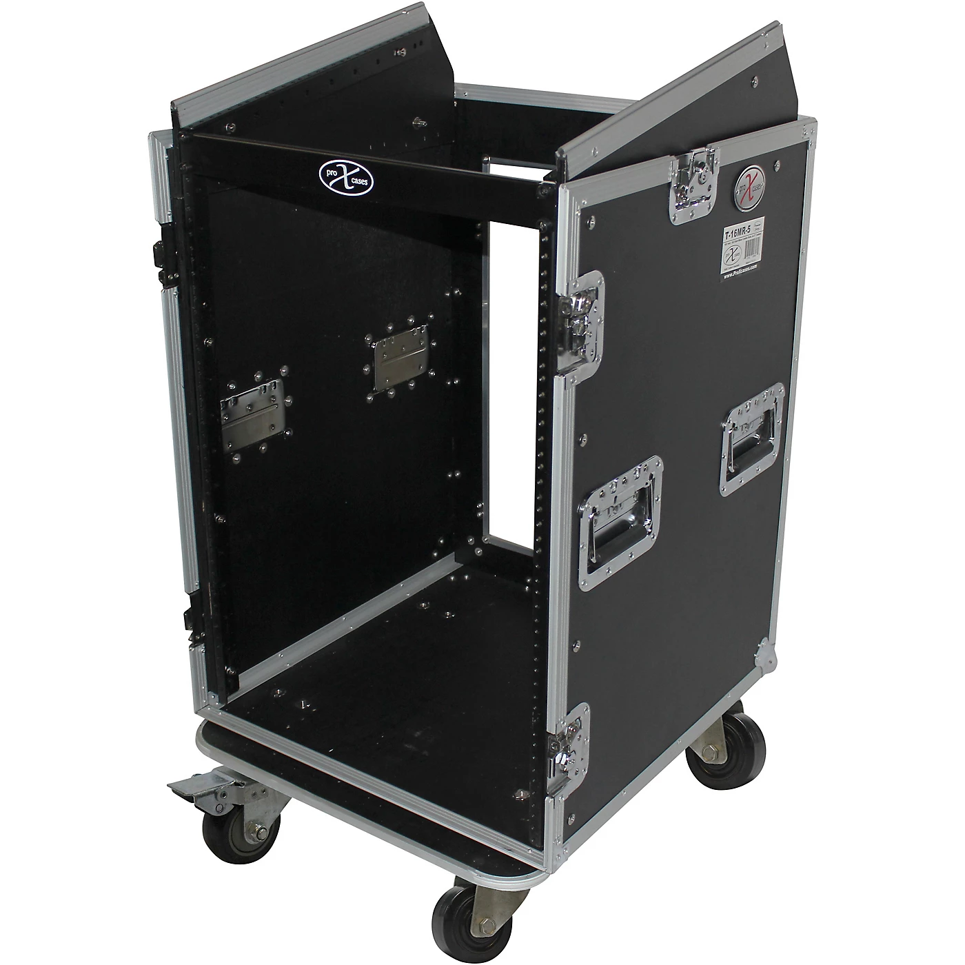 The ProX T-16MRSS 16U Rack x 10U Top Mixer DJ Combo Flight Case is a slant mixer rack system with all the best features you’re looking for in a world-class flight case. It has strength, durability and reliability with flexible options and sizing for different applications.This heavy-duty professional combo rack is 20″ deep and features 16U front loading and 10U top loading rails for a wide variety of pro DJ mixers, amplifiers, effects and any other standard 19″ pro audio DJ gear. Other design highlights include a large swinging rear door (for easy wiring) with a beveled cable hole for permanent or semi-permanent installation. It also includes two handles on either side of the case and 4″ locking casters for convenient transportation and mobility.